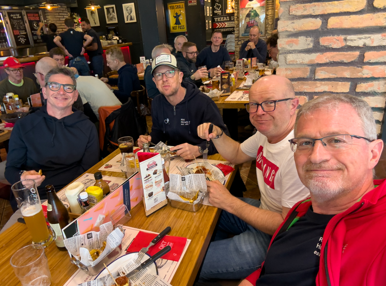 Am Nachmittag schauten wir uns mit ein paar Leuten Paris-Roubaix der Männer in einem Burgerladen an.