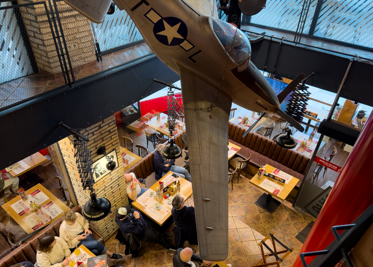 Witziger Laden, mit einem großen Modell der P-51 Mustang an der Decke.