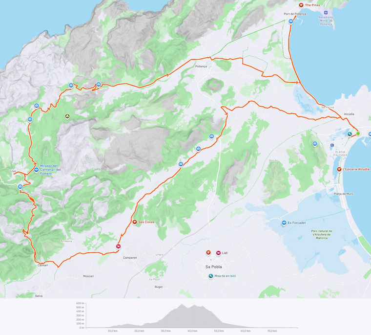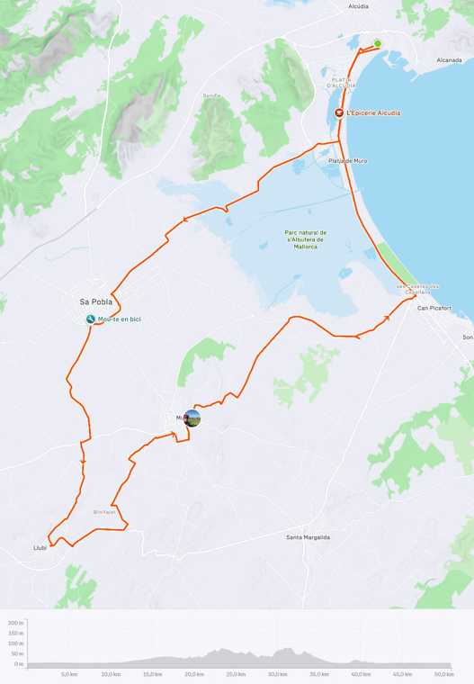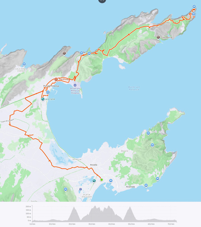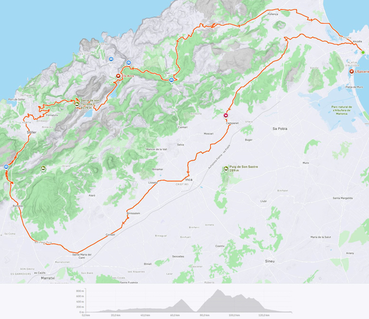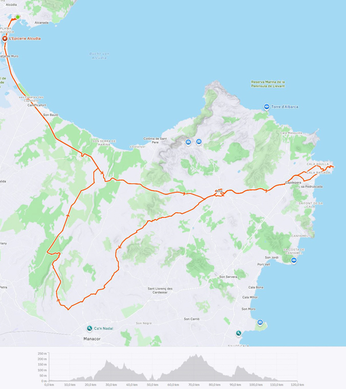 Ich hatte mir für den 5. Tag bereits zwei relativ einfache, kurze und flache Strecken auf Komoot ausgesucht und auf meinen Garmin geladen, da kam der Routenvorschlag für den nächsten Tag: die Königsetappe nach Soller und zum Puig Major mit ca. 130 km und 2000 Höhenmeter. Der 2. Tag mit den 120 km und 1146 Höhenmetern, wo ich am Ende total im Arsch war, lag noch nicht allzu weit entfernt und ich lehnte das für mich ab.